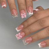 24Pcs Pink French Style Fake Nails 3D Bowknot Designs Short Square Press on Nails Sweet Korean Fashion False Nail for Women Girl