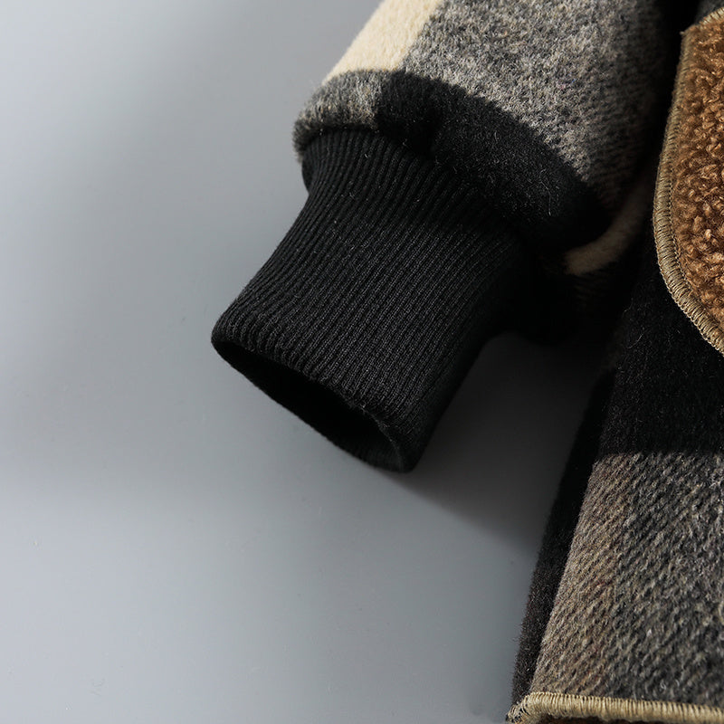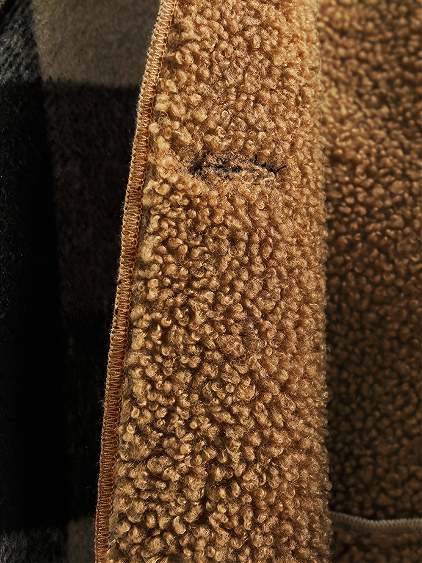 Boys' Cozy Fleece-Lined Plaid Jacket with Button Front, Pockets & Hood - Long Sleeve Casual Winter Coat for Fall/Winter, Brown & Black Checkered Pattern, Cozy Outerwear, Durable Outerwear